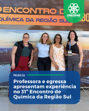 A Profa. Dra. Dileize Valeriano da Silva e a egressa Evely Bernardi da Maia, ambas vinculadas ao curso de Química do Campus de União da Vitória da Unespar, participaram do 31º Encontro de Química da Região Sul (SBQSul), realizado entre os dias 19 e 21 de novembro, no Campus de Toledo da Unioeste.