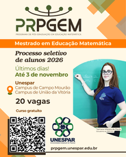 O Programa de Pós-Graduação em Educação Matemática (PRPGEM) da Universidade Estadual do Paraná (Unespar) está com processo seletivo aberto para alunos regulares com ingresso em 2026, nos campi de Campo Mourão e União da Vitória. O edital prevê o preenchimento de 20 vagas, sendo que as inscrições ficarão abertas até o dia 3 de novembro.